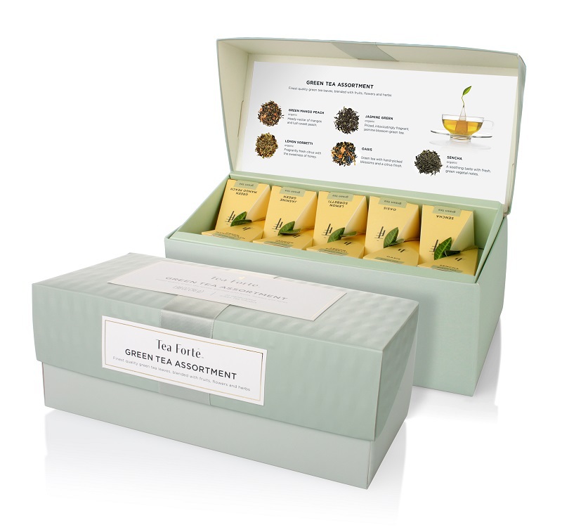 Der perfekte Einstieg in das Tea Forté-Erlebnis. Diese wunderschön verpackte und stets geschätzte Teekollektion ist eine willkommene Präsentation der außergewöhnlichsten Tees der Welt. Die Präsentationsbox des Grünteesortiments enthält 20 pyramidenförmige Tee-Einsätze mit je 4 der folgenden Grünteemischungen: Green Mango Peach, Jasmine Green, Lemon Sorbetti, Maroccan Mint und Sencha.