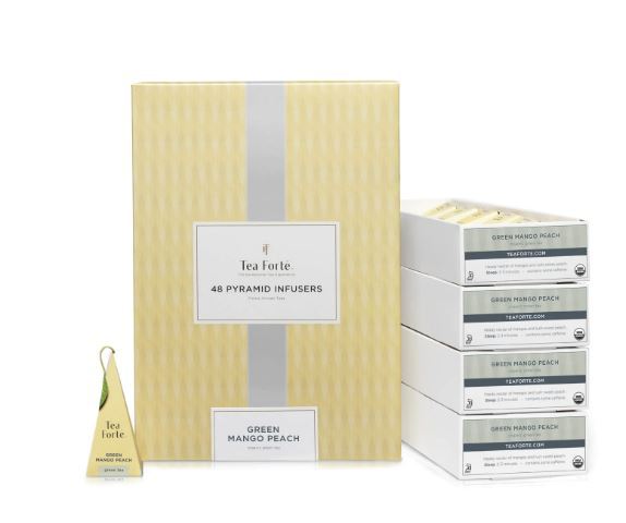 Green Mango Peach contient des feuilles de thé vert de la plus haute qualité, mélangées à de la menthe poivrée fraîche, avec une saveur de mangue enivrante et le goût sucré et juteux de la pêche.