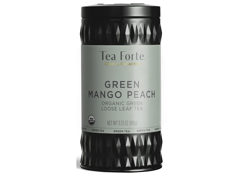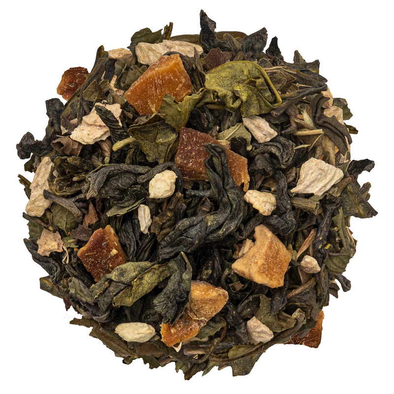 Green Mango Peach contient des feuilles de thé vert de la plus haute qualité, mélangées à de la menthe poivrée fraîche, avec une saveur de mangue enivrante et le goût sucré et juteux de la pêche.