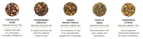 un mini Petit Coffret de Présentation avec 10 infuseurs pyramidaux, deux pour chacun des cinq mélanges de la collection : Camomille Citron (tisane), Chocolat Rose (thé noir), Mangue Verte Pêche (thé vert), Fraise Hibiscus (thé oolong), Poire Vanille (thé blanc)
