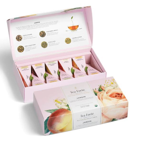 Cette boîte contient 10 infuseurs de thé pyramidaux, 2 de chaque mélange : Chamomile Citron (tisane), Chocolat Rose (thé noir), Green Mango Peach (thé vert), Strawberry Hibiscus (Oolong), et Vanilla Pear (thé blanc).