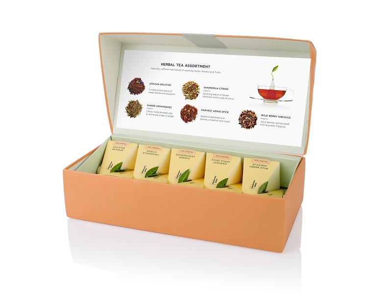 La petite boîte de présentation de l'assortiment de tisanes contient 10 infuseurs à thé pyramidaux, 2 de chacun des mélanges de tisanes suivants : African Solstice, Chamomile Citron, Ginger Lemongrass, Harvest Apple Spice et Wild Berry Hibiscus. Le couvercle ouvert révèle un menu de dégustation détaillé. Sans caféine.