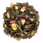 Eine fröhliche Kombination aus schwarzen Kirschen, Blumen und grünem Bio-Tee.