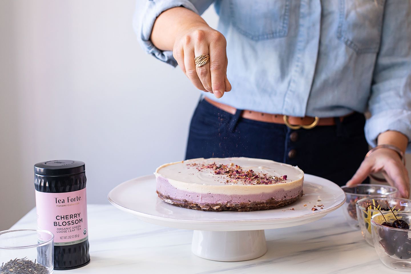 Provate questo dessert vegano al tè che è tanto nutriente quanto delizioso. La cheesecake è sempre uno spettacolo e i fiori di ciliegio sono il segno perfetto che la primavera è finalmente arrivata. Il tè verde Cherry Blossom ha bellissime note di ciliegia e petali di rosa. Abbiamo pensato che i tannini del tè verde si sposassero bene con una cheesecake vegana. È un modo fantastico per aggiungere una maggiore profondità di sapore in modo molto creativo. Leggera, perfettamente dolce e floreale, pensiamo che sarà difficile resistere a questa cheesecake mattina, pomeriggio e sera.