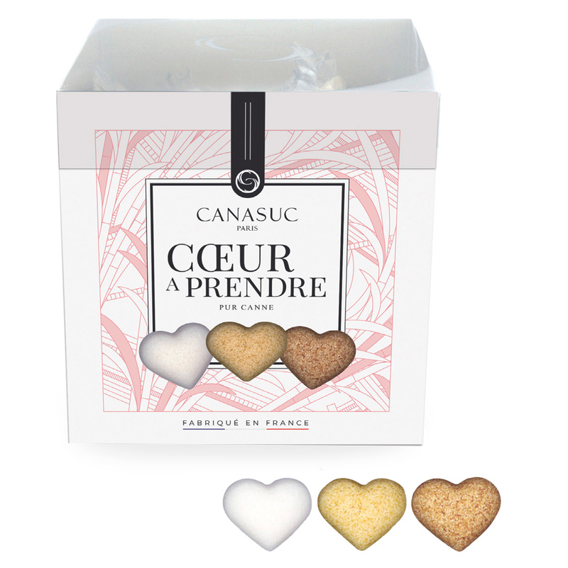 Perfette per occasioni speciali per dare un tocco di romanticisimo, le zollette a forma di cuori bianchi, ambra ed ebano "Cœurs à prendre" sono confezionate in bustine singole compostabili.