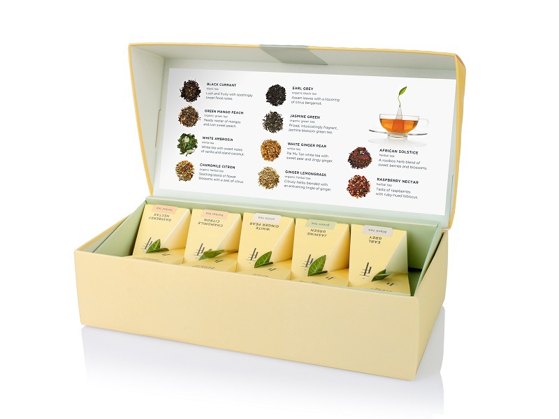 Ogni confezione contiene 10 infusori di tè a piramide, uno per ciascuna delle seguenti miscele: Black Currant (tè nero), Earl Grey (tè nero), Green Mango Peach (tè verde), Jasmine Green (tè verde), White Ambrosia (tè bianco), White Ginger Pear (tè bianco), African Solstice (rooibos), Chamomile Citron (tisana), Ginger Lemongrass (tisana), Raspberry Nectar (tisana).