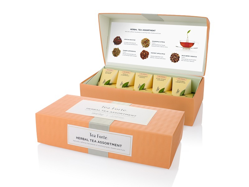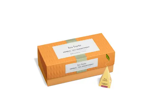 La scatola di presentazione Petite Herbal Tea Assortment contiene 10 infusori piramidali, 2 ciascuno delle seguenti miscele di tisane: African Solstice, Chamomile Citron, Ginger Lemongrass, Harvest Apple Spice e Wild Berry Hibiscus. Il coperchio aperto rivela un menu di degustazione dettagliato. Senza caffeina