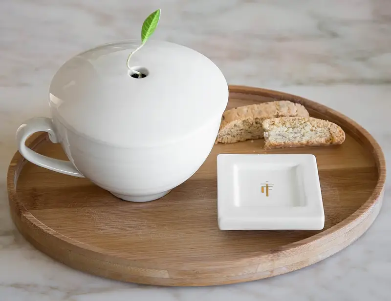 Vassoio di design con finitura in bambù, adatto per contenere una tazza di tè e un vassoiettio appoggia filtro.