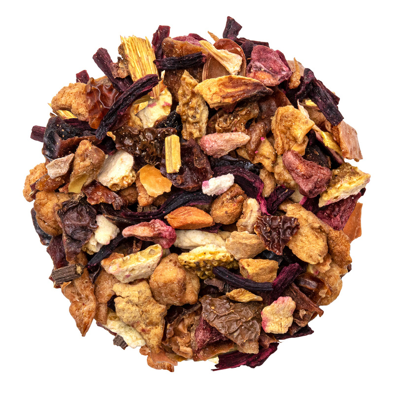 Deliziose note fruttate per una tisana a base di lamponi, ibisco, mela, rosa canina.