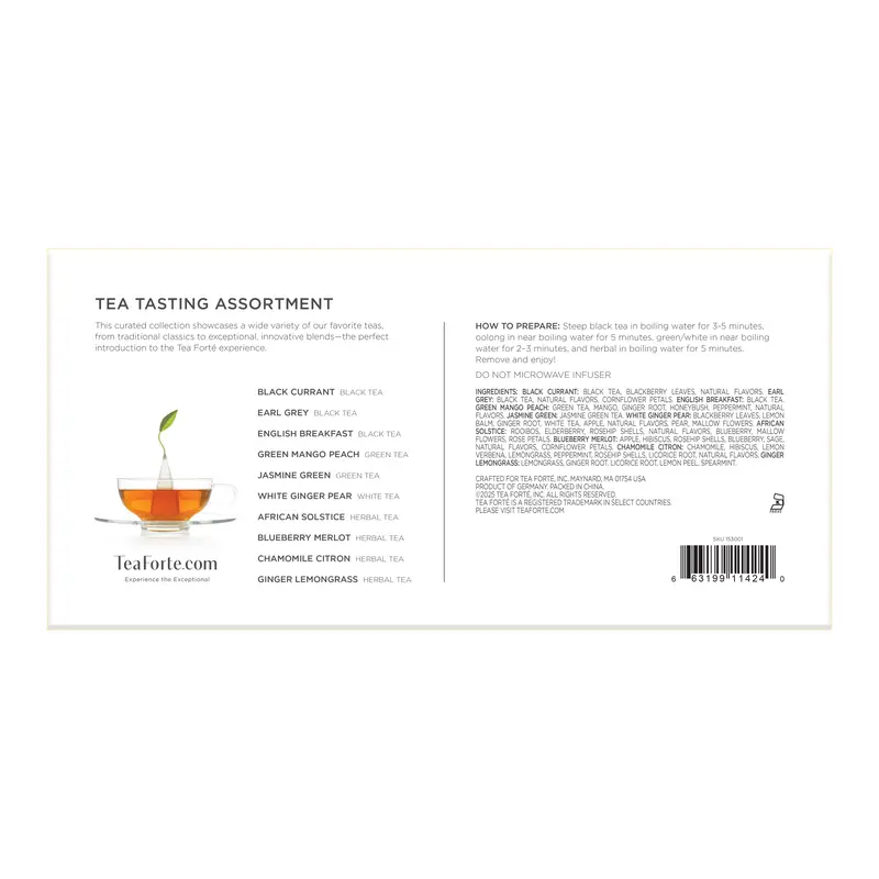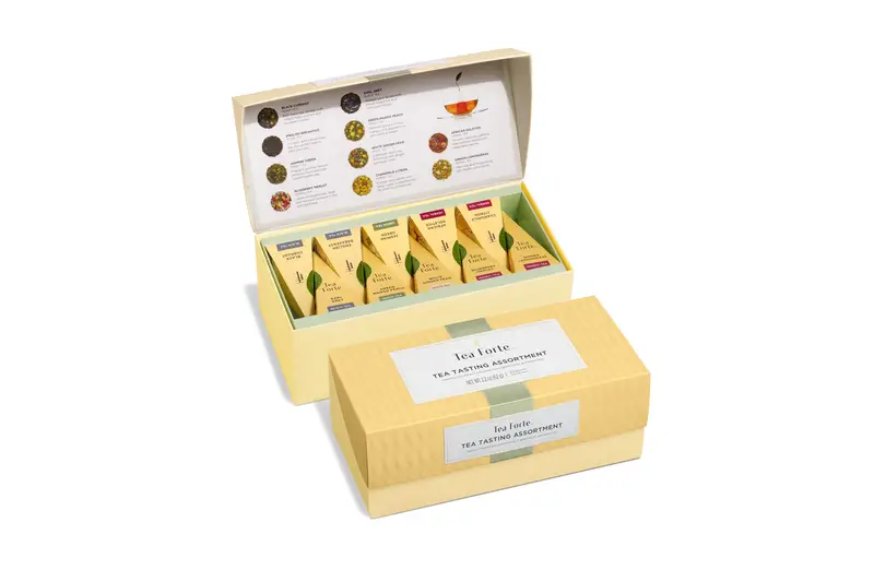 Un elegante cofanetto regalo per una degustazione delle migliori miscele di Tea Forté. La confezione contiene due iconici filtri piramidali per ognuna delle 10 miscele: